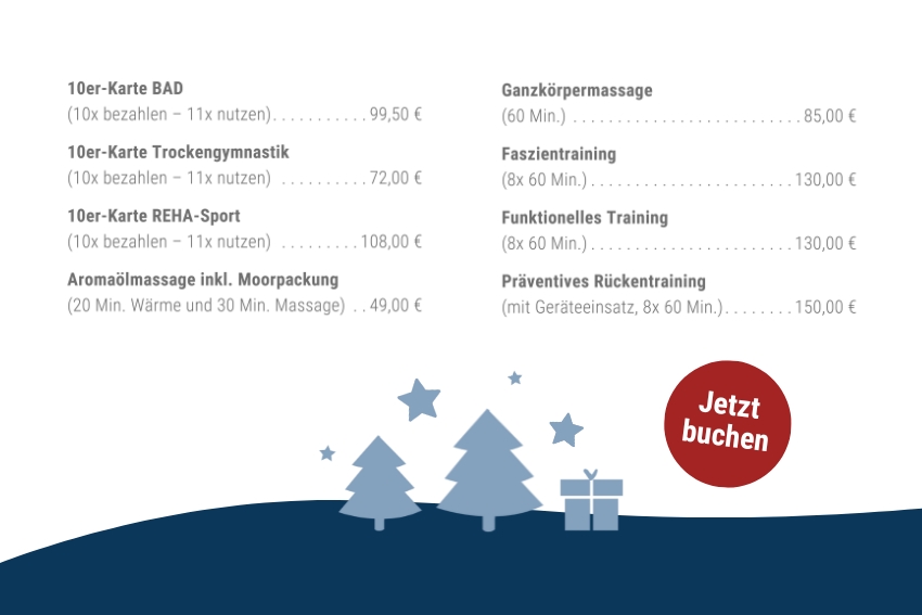 erschenken Sie dieses Jahr etwas wirklich Wertvolles: Gesundheit. Unsere Physiotherapie-Gutscheine sind das perfekte Geschenk für Entspannung, Regeneration und neue Energie.